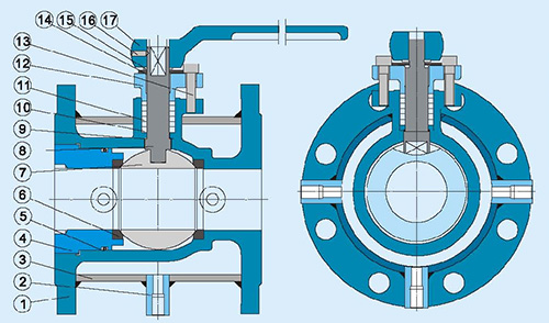 圖中數(shù)字解析:1表示閥體,2表示連接口,3表示夾套,4表示鎖緊螺母,5表示O型圈,6表示密封圈,7表示球體,8表示閥桿,9表示墊片,10表示填料墊,11表示填料,12表示填料壓蓋,13表示螺釘,14表示定位片,15表示擋圈,16表示螺釘,17表示手柄。