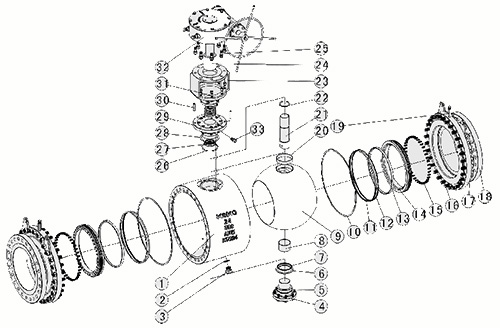 圖中標(biāo)注數(shù)字解析:1表示球體,2、25表示軸襯,3表示密封圈,4表示閥座,5、9、22、31表示O型圈,6表示防火墊,7表示支撐圈,8、27表示彈簧,10、23表示注脂閥,11、17、21、32表示墊片,12表示閥蓋,13表示螺柱,14表示螺母,15、18、34表示螺釘,16表示螺塞,19表示球,20表示底蓋,24表示閥體,26表示排泄閥,28表示鍵,29表示閥桿,30表示止推軸承,33表示上閥桿座,35表示填料,36表示填料壓套,37表示壓板,38、39、41表示螺栓,40表示支架,42表示驅(qū)動(dòng)結(jié)構(gòu)。