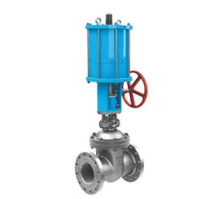 氣動帶手動閘閥是具有氣動執(zhí)行機構(gòu)(雙層氣缸,并帶有緩沖機構(gòu))和手動及其保護機構(gòu)(手動和可自鎖的氣動-手動轉(zhuǎn)換裝置)的低支架明桿閘閥。該閥門由于采用雙層氣缸結(jié)